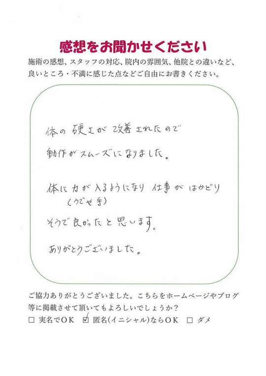 体に(うでや手)力が入るようになり、仕事がはかどりそうで良かったと思います。