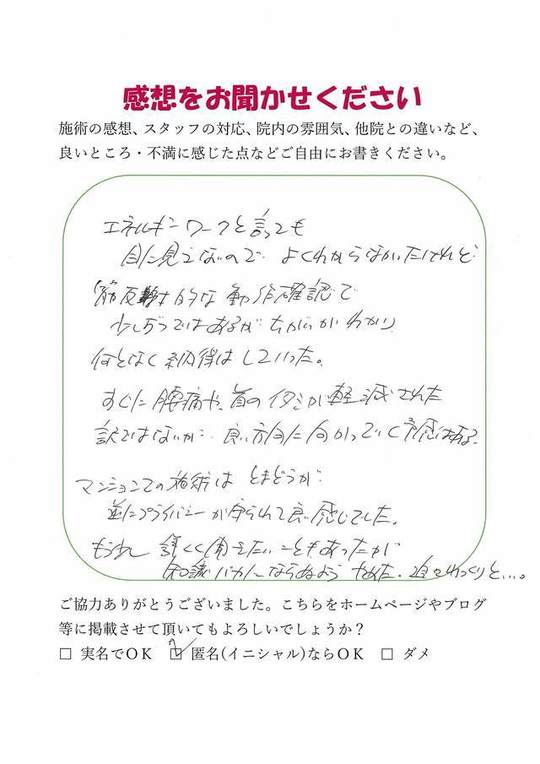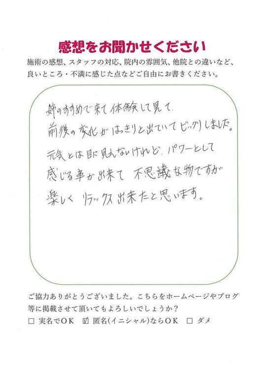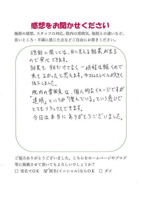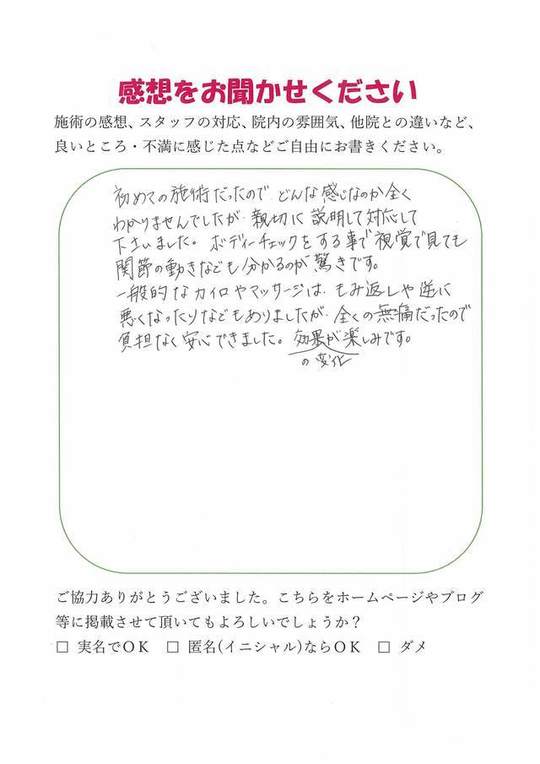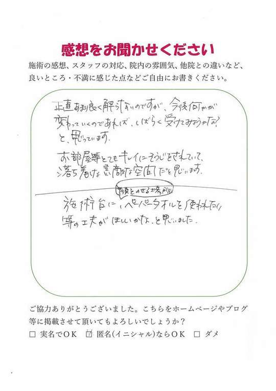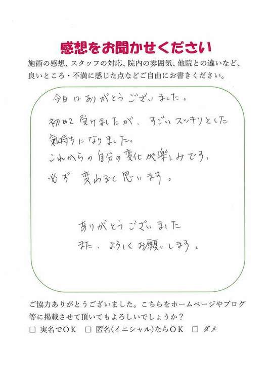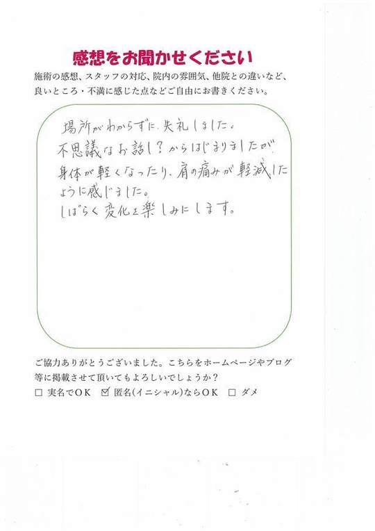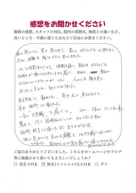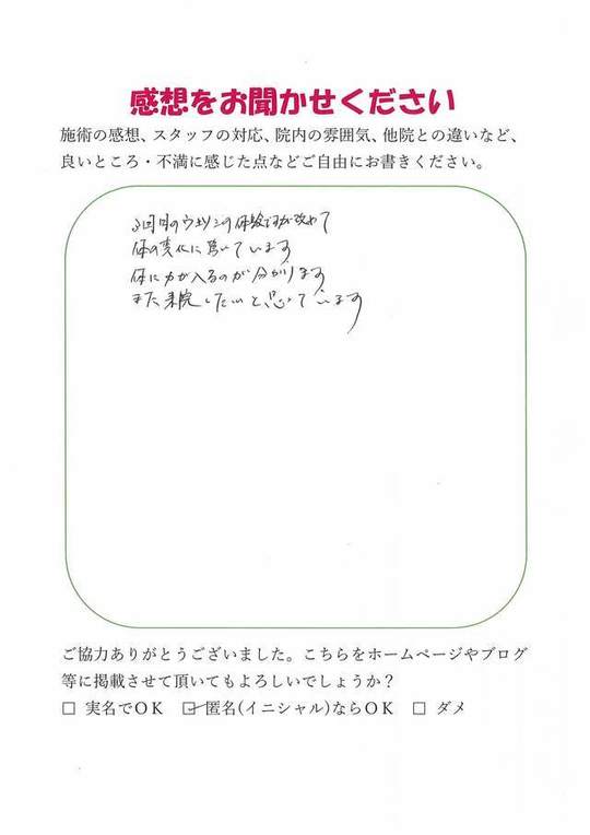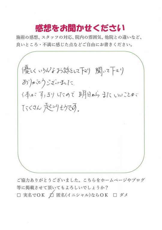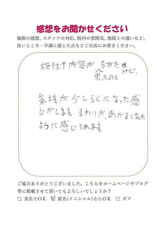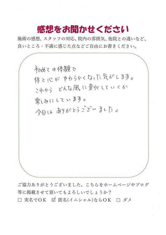 施術内容が思ったのとちがったけど、気持ちが少しらくになった感じがします。