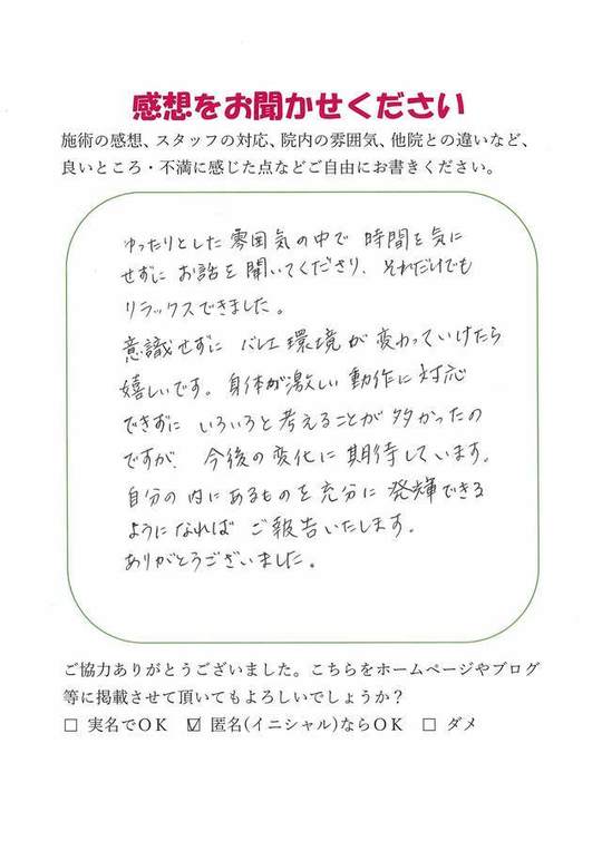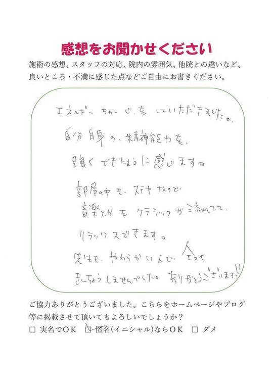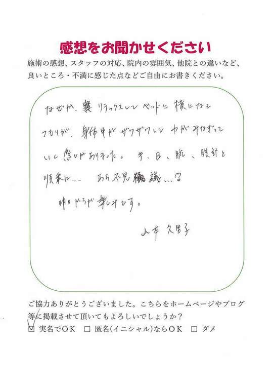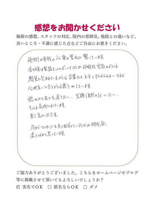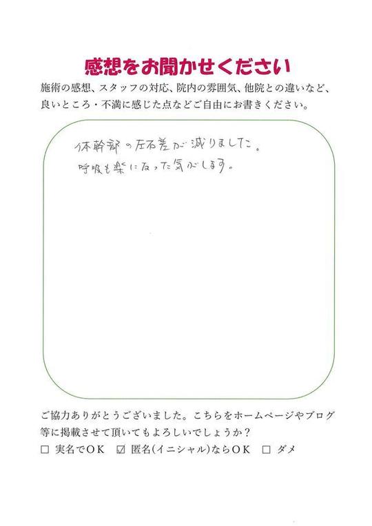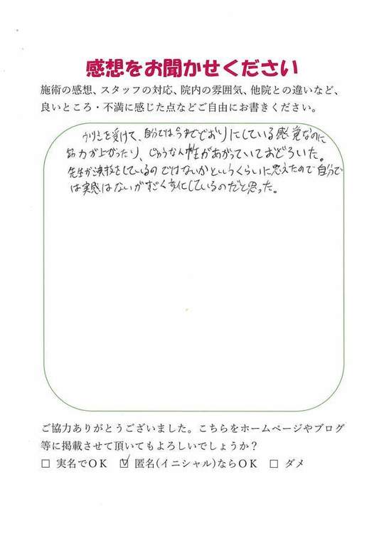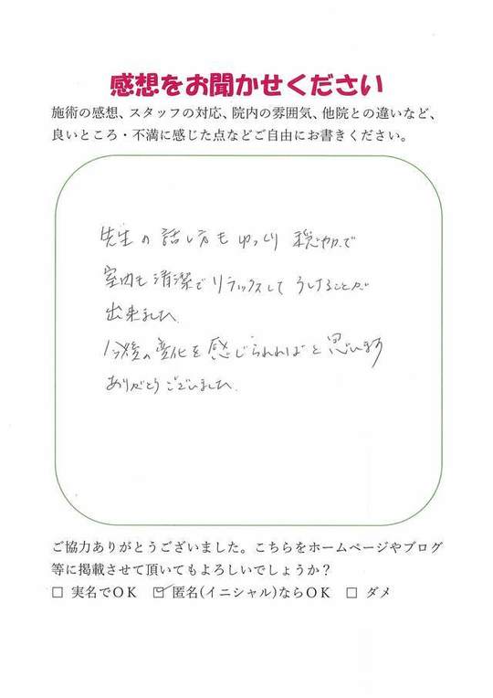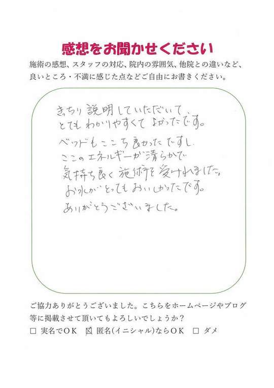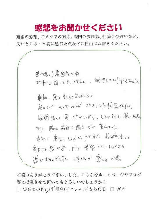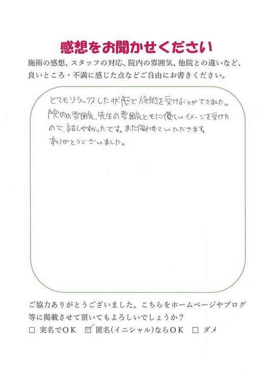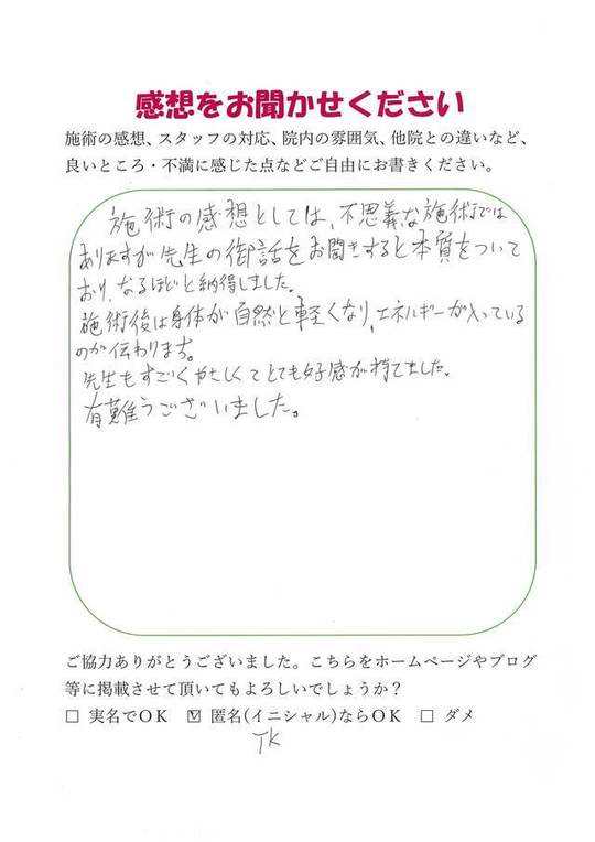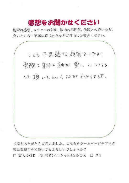 施術内容が思ったのとちがったけど、気持ちが少しらくになった感じがします。