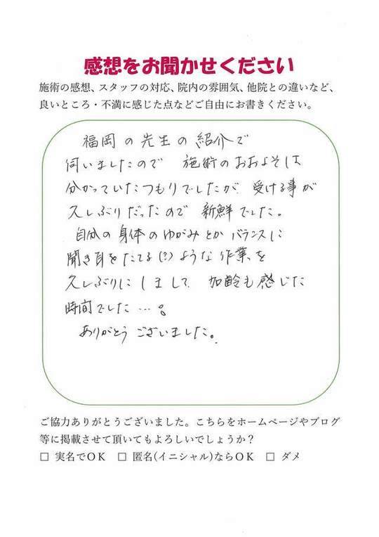 福岡の先生の紹介で伺いましたので、施術のおおよそは分かっていたつもりでしたが、受ける事が久しぶりだったので新鮮でした。