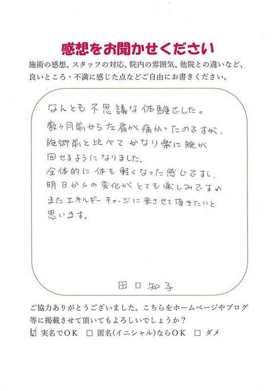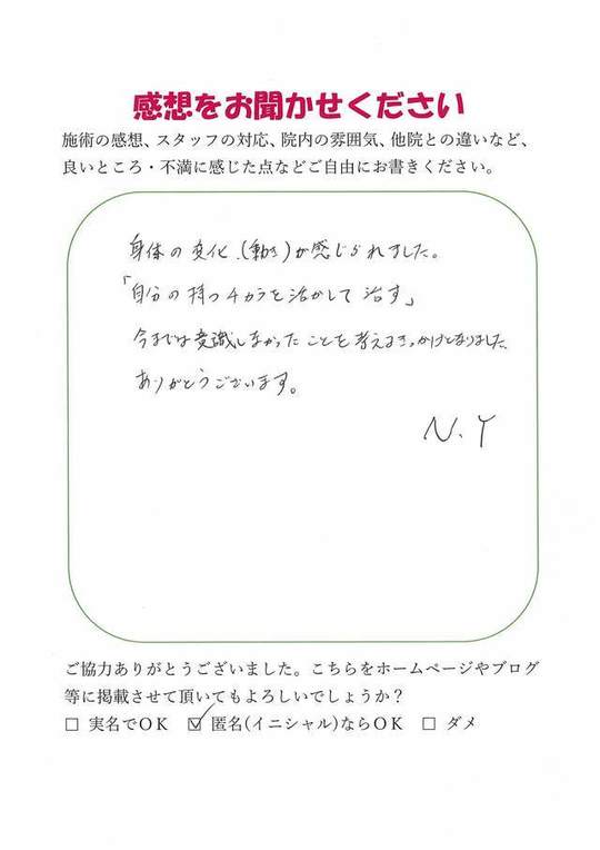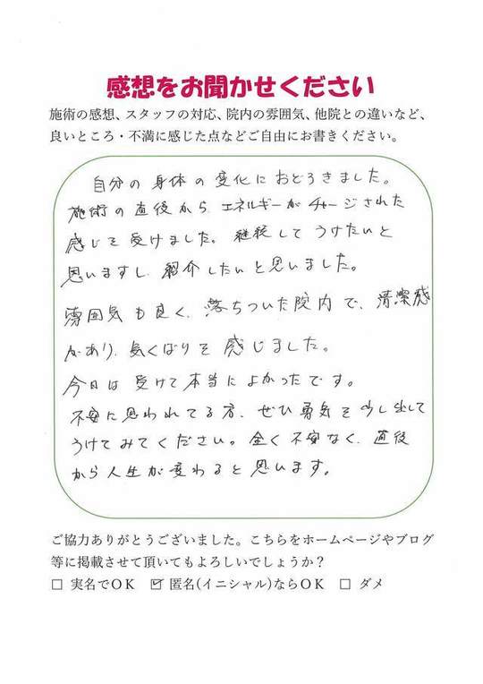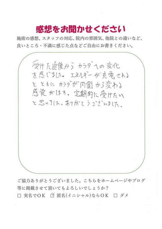 施術の直後からエネルギーがチャージされた感じを受けました。継続してうけたいと思いますし、紹介したいと思いました。