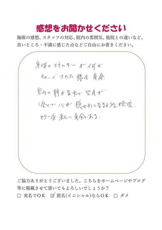 ベッドもここち良かったですし、ここのエネルギーが清らかで気持ち良く施術を受けれました。