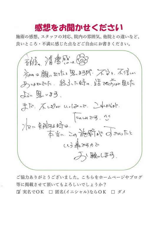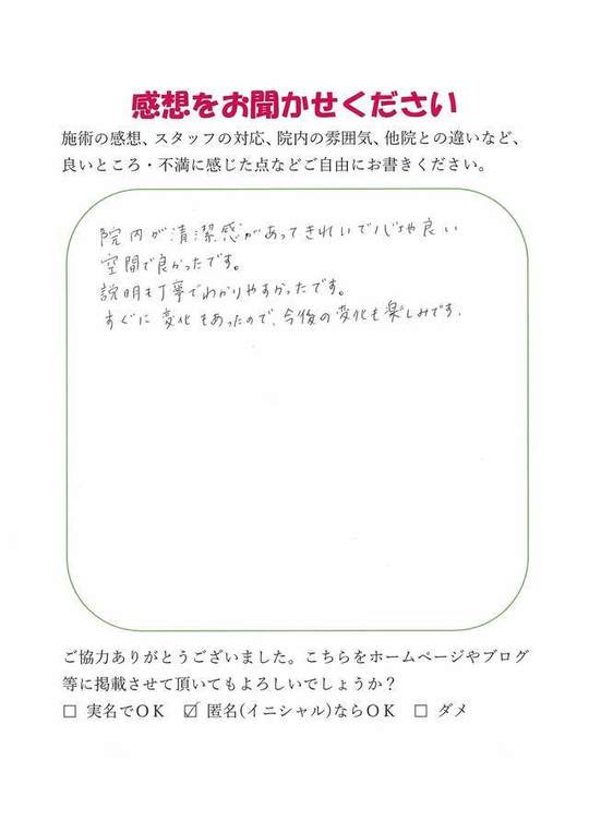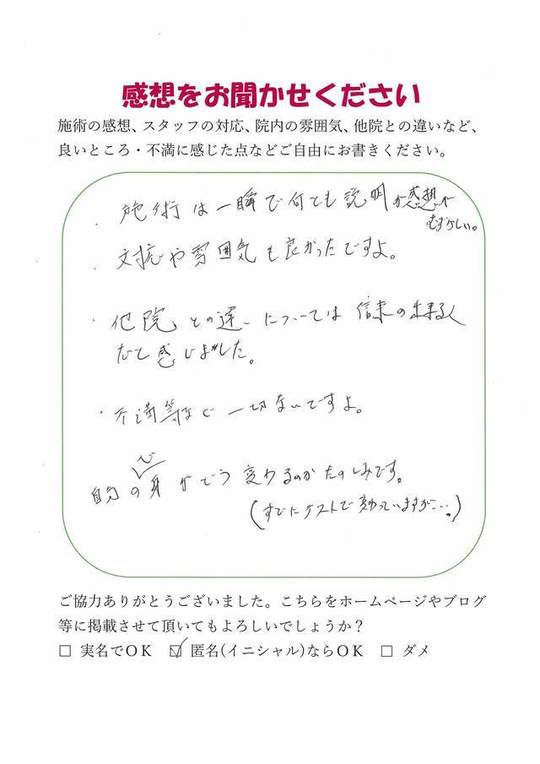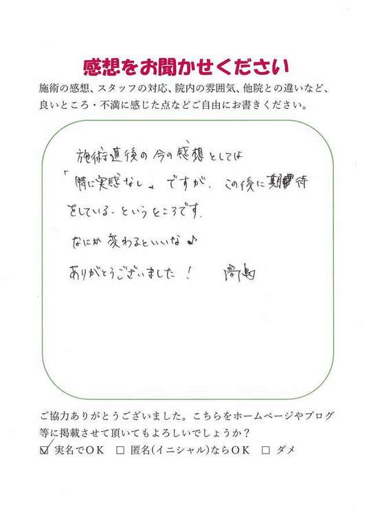 施術後の今の感想としては「特に実感なし」ですが、この後に期待をしている、というところです。