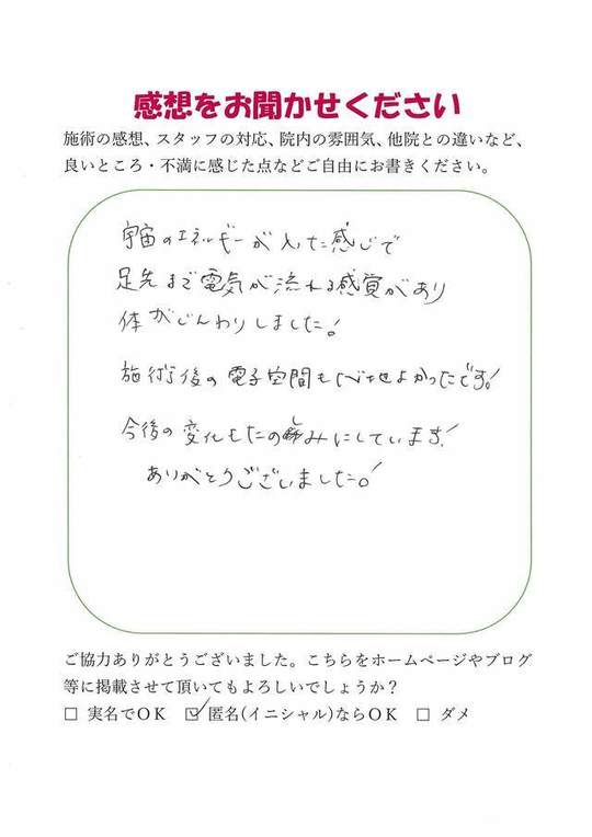 受ける前は緊張でいっぱいでしたが、施術後空気のような感覚に包まれているような言葉では上手く伝えられないけれど、心地良いと言うような感じがしています。