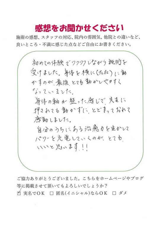 初めての体験でワクワクしながら施術を受けました。身体を横に(左右)に動かすのが最後とても動かしやすくなっていました。