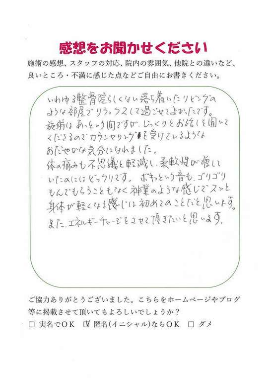 体の痛みも不思議と軽減し、柔軟性が増していたのにはビックリです。ボキッという音も、ゴリゴリもんでもらうこともなく神業のような感じでスッと身体が軽くなる感じは初めてのことだと思います。