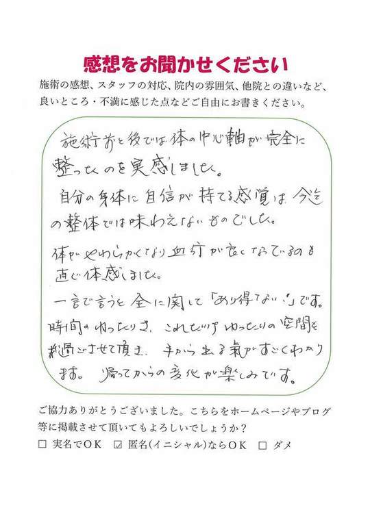 自分の身体に自信が持てる感覚は今迄の整体では味わえないものでした。
