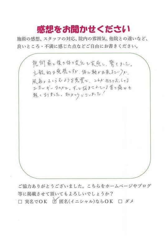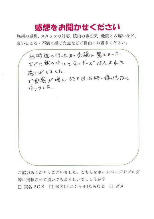 数ヶ月前から左肩が痛かったのですが、施術前と比べてかなり楽に腕が回せるようになりました。