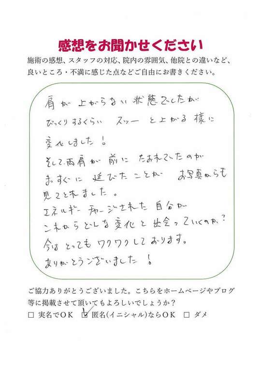肩が上がらない状態でしたが、ビックリするくらいスーッと上がる様に変化しました!