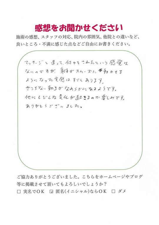 マッサージと違って何かをされたという感覚はありませんが、身体がスムーズに動かせるようになった実感がすごくあります。
