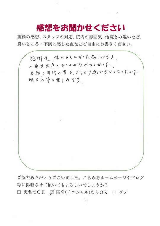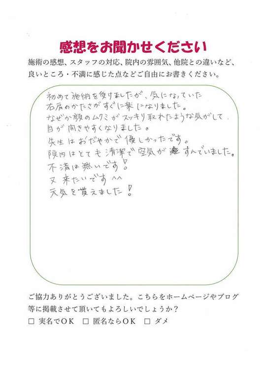 初めて施術を受けましたが、気になっていた右肩のかたさがすぐに楽になりました。