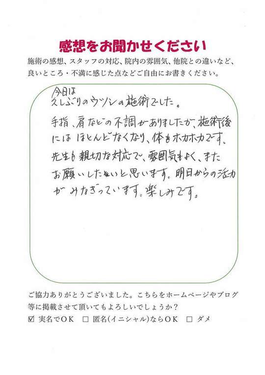 手指、肩などの不調がありましたが、施術後にはほとんどなくなり、体もホカホカです。