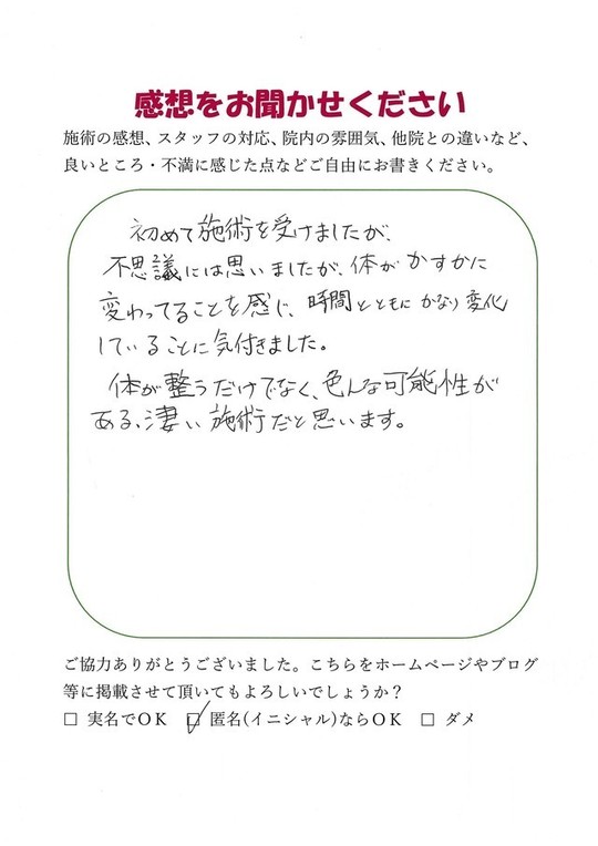 初めて施術を受けましたが、不思議には思いましたが、体がかすかに変わってることを感じ、時間とともにかなり変化していることに気付きました。