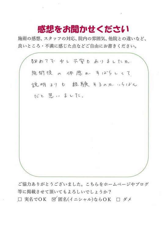 初めてで少し不安がありましたが、施術後の体感がすばらしくて説明よりも経験するのがいちばんだと思いました。