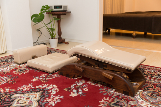 こちらのスペースで検査と施術を行います。写っているのは施術に使うニーチェストテーブルです。ニー(=膝)とチェスト(=胸部)で体を支えることからそう呼ばれています。正式名称はFujibuchi-special MarkⅢと言います。このテーブルに体を預けることにより、首の筋肉が極限まで弛緩する体勢がとれ、エネルギーを伝達させることが可能になるのです。
