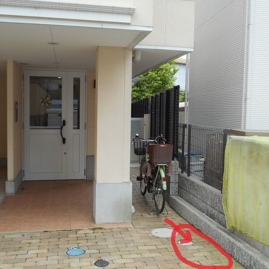 自転車でお越しの方は、マンション玄関の斜め横にとめて下さい。写真では緑色の自転車が止めてありますが、これよりはもう少し後ろ側でお願いします。
