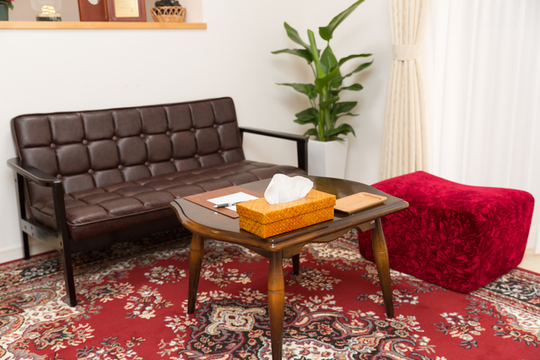 当サロンはそれほど広くはありませんので、後述の施術スペースと部屋を共有しております。なかなか座り心地の良いソファーです♪ 清潔感がありシックな雰囲気でリラックスできますよ。こちらでお話を聞いたり、説明をさせて頂いたりします。